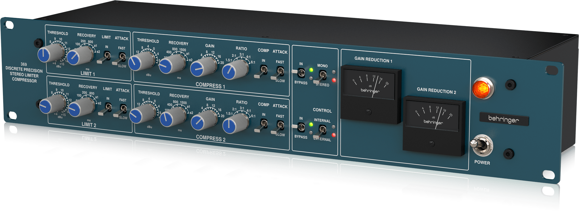 Al ser un compresor de dos canales, puedes configurar el 369 para operar en estéreo o mono con solo pulsar un interruptor. También puedes anular cada compresor y limitador individualmente para mayor flexibilidad. Además, el interruptor de control te permite alternar entre el control interno, que te permite ajustar las funciones mono/estéreo y bypass desde el panel frontal, o el control externo para control remoto mediante un mezclador como el Behringer WING o cualquier otro dispositivo de control remoto personalizado conectado a la toma de voltaje de control tándem del panel trasero.