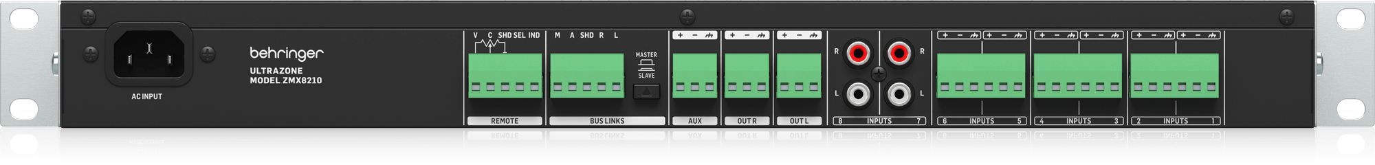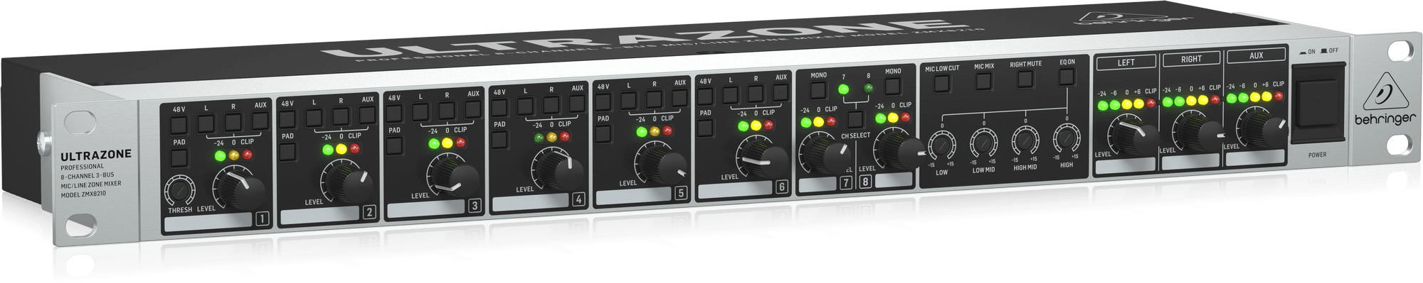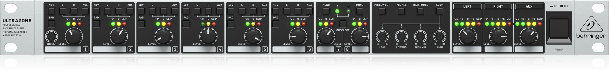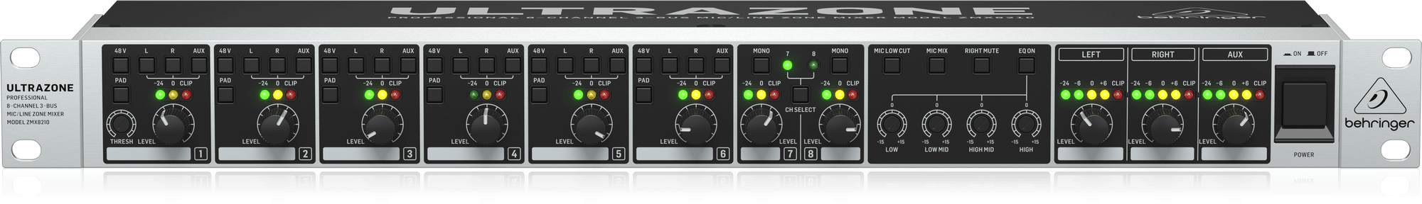 El mezclador de zona ULTRAZONE ZMX8210, un mezclador de audio profesional de 8 canales diseñado específicamente para instalaciones fijas, es montable en rack y puede distribuir su programación musical y anuncios a hasta tres zonas (salas). Sus aplicaciones típicas incluyen restaurantes, oficinas, gimnasios y lugares de culto, entre otros.