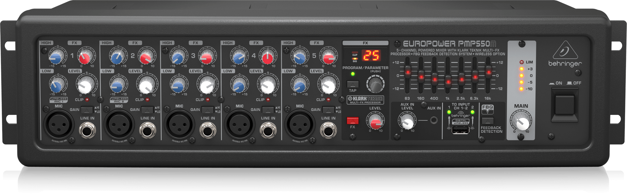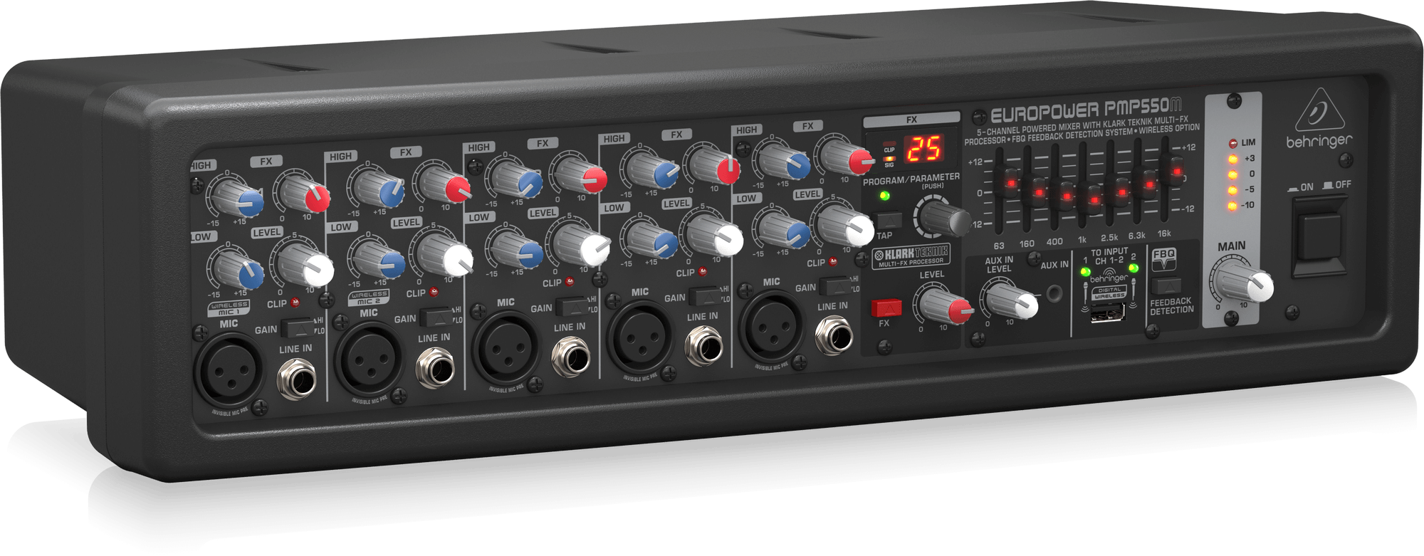 El increíble mezclador autoamplificado PMP550M ofrece una potencia excepcional (2 x 250 vatios en modo dual mono), manteniendo una increíble relación potencia-peso. Estos mezcladores emplean tecnología Clase D de alta eficiencia y una fuente de alimentación conmutada de última generación, lo que reduce significativamente el peso y la temperatura. El PMP550M de 5 canales cuenta con 5 preamplificadores de micrófono de alta calidad (2 de los cuales también admiten nuestros micrófonos inalámbricos digitales ULM, disponibles por separado) y una entrada auxiliar de 3,2 mm para reproducir música desde sus dispositivos inteligentes. Para un toque profesional adicional, hemos añadido un procesador multiefectos KLARK TEKNIK de 24 bits con 25 presets que incluyen reverberaciones de estudio, delays, pitch shifter y varios multiefectos, además de un ecualizador gráfico estéreo de 7 bandas con nuestro sistema patentado de detección de realimentación FBQ, para un rendimiento sin realimentación excepcional.